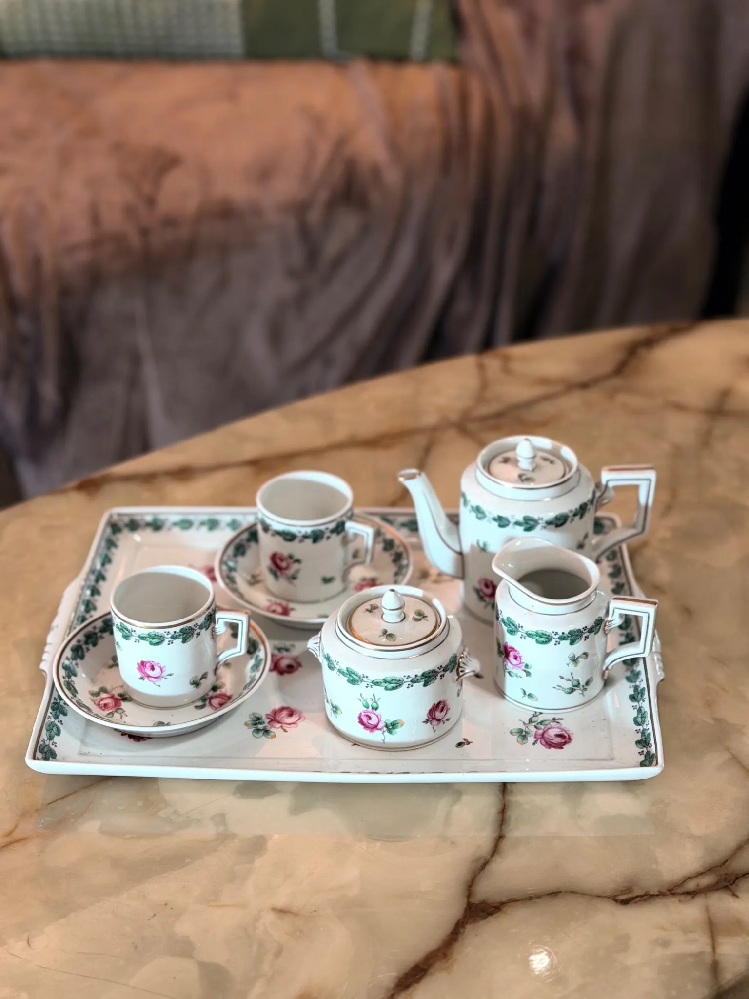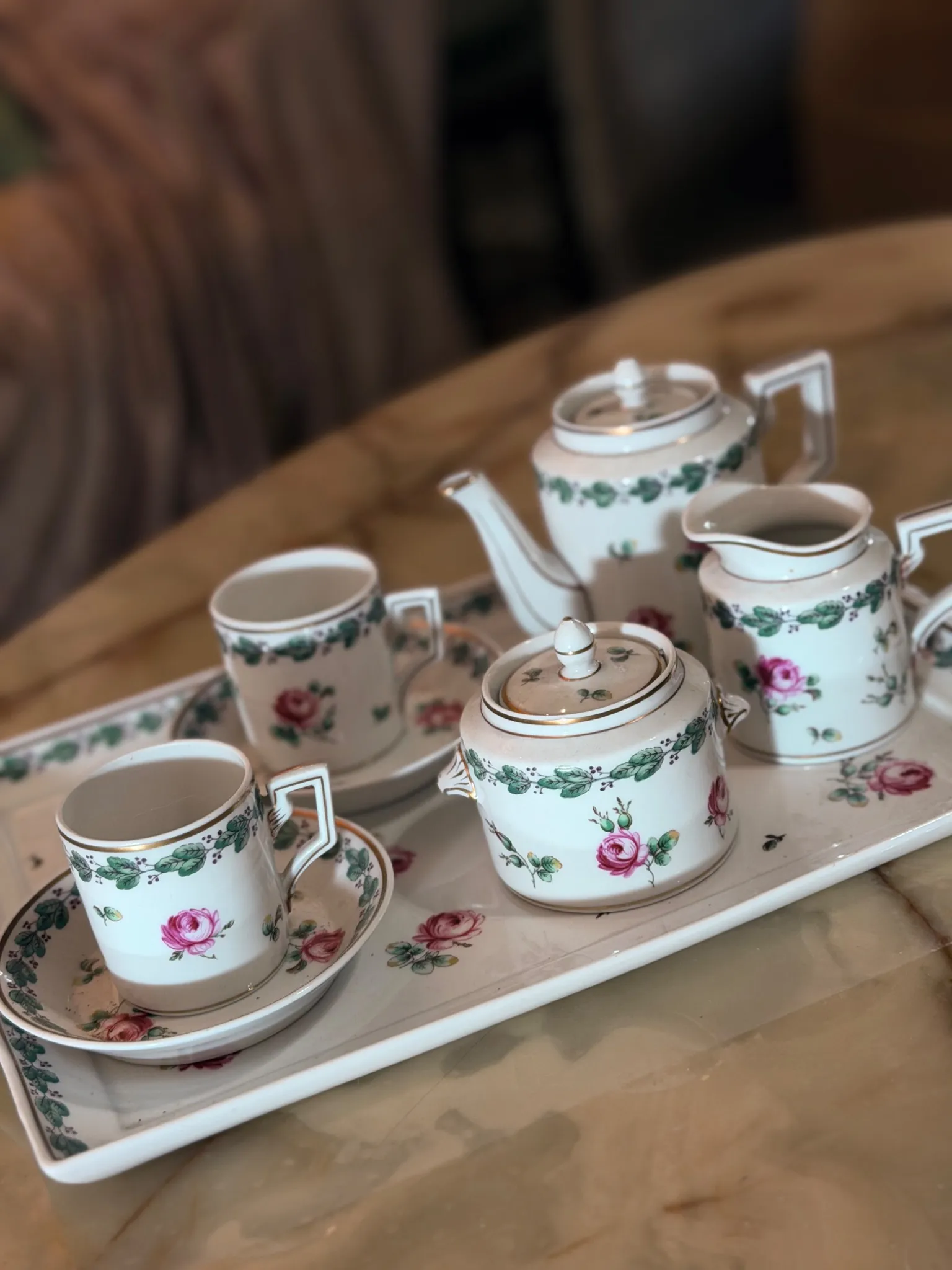 Charmant service à café en porcelaine fine de la manufacture italienne Richard Ginori, décoré de guirlandes florales et de roses roses sur fond blanc. L’élégance du modèle Mokka Lodi se distingue par ses lignes géométriques, son liseré doré et ses formes carrées modernistes, très caractéristiques de cette série.