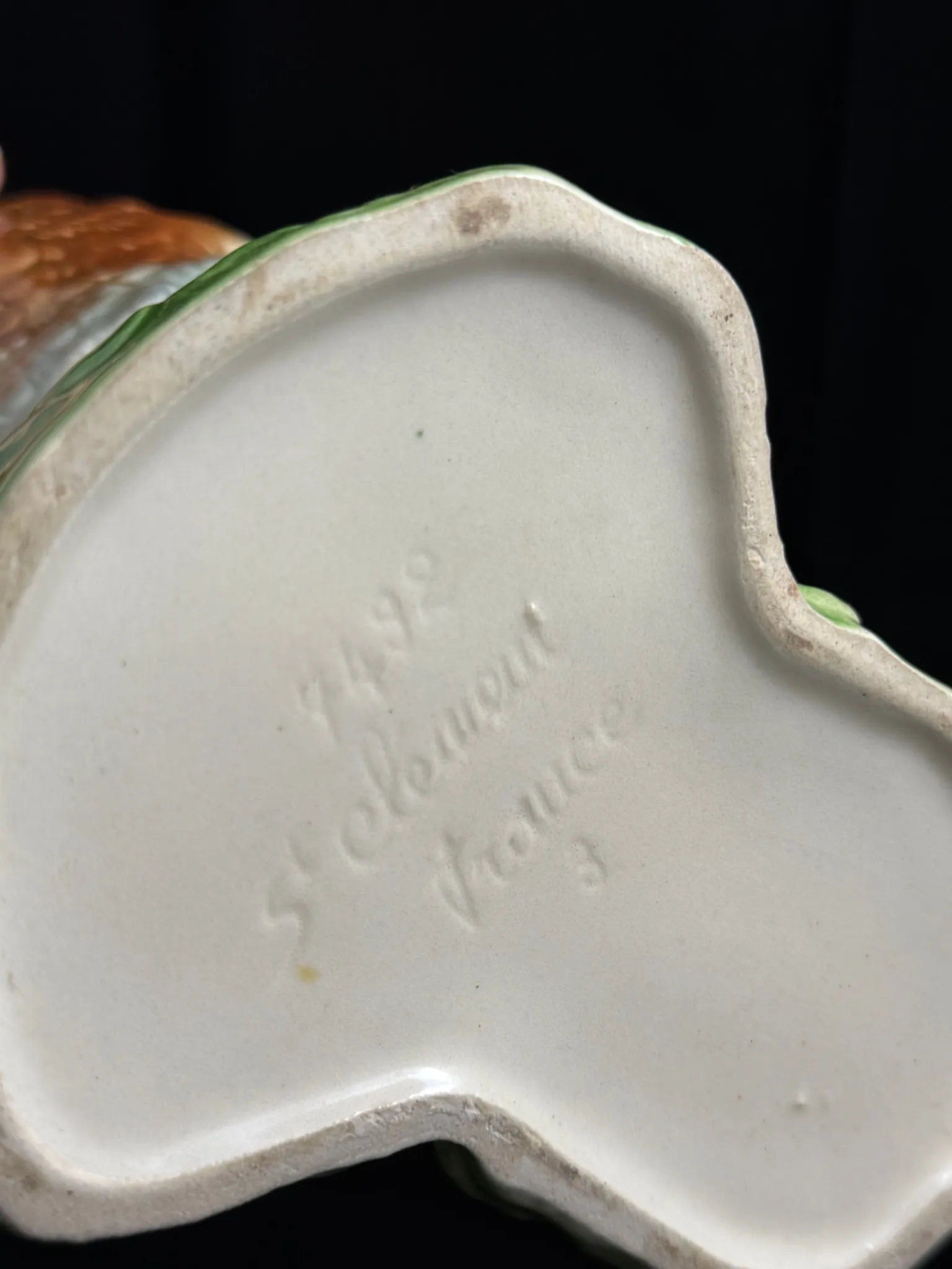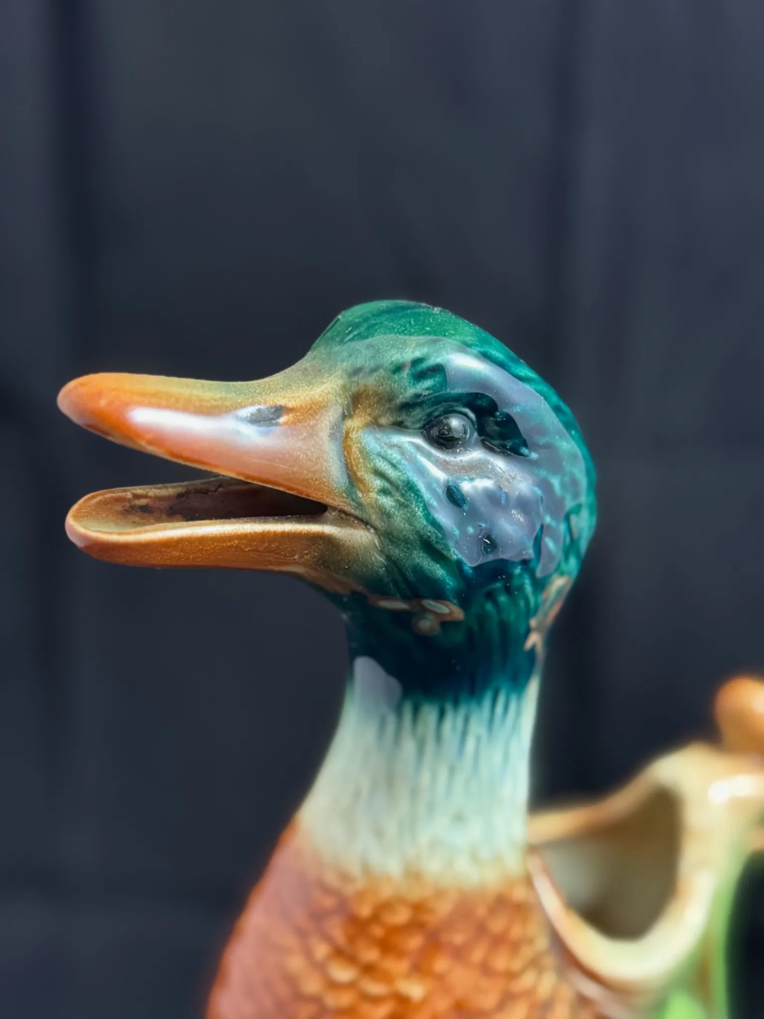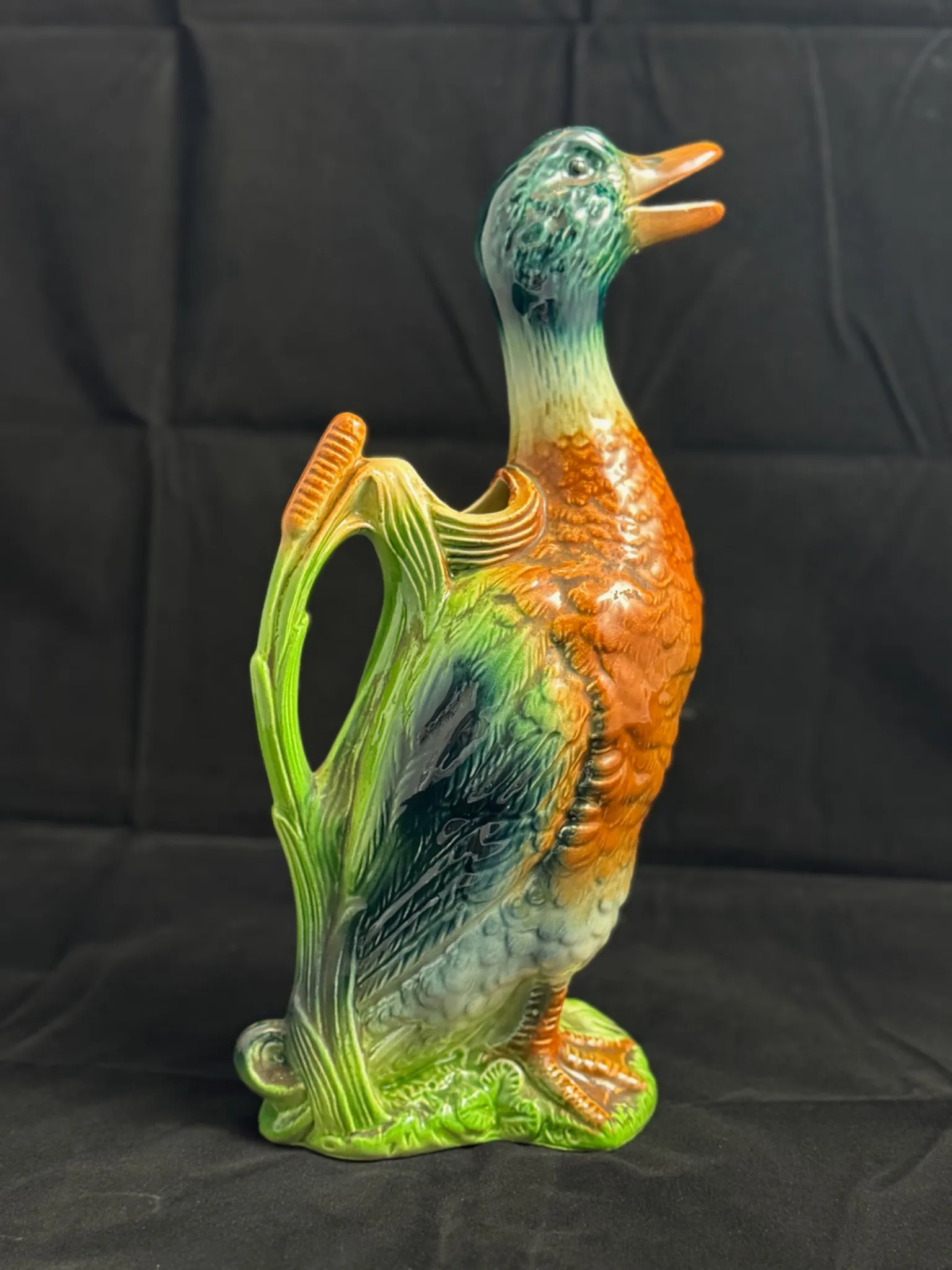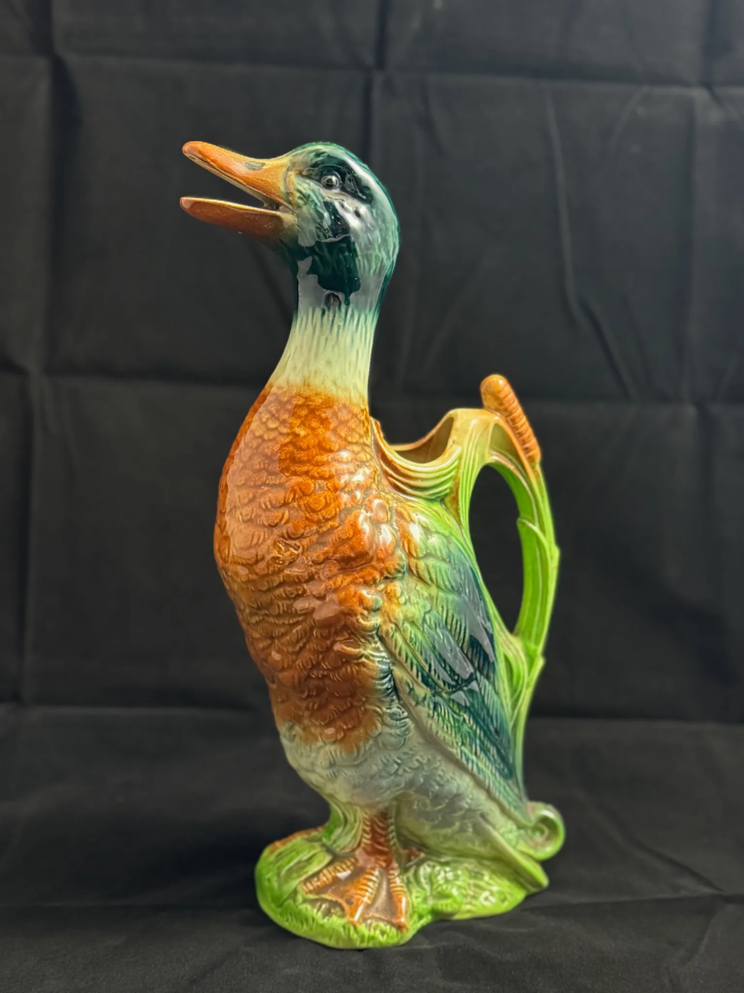 Magnifique pichet en barbotine en forme de canard, une pièce emblématique du savoir-faire de la manufacture de Saint Clément en France. Ce modèle, très prisé des collectionneurs, se distingue par ses couleurs vibrantes et son émaillage brillant qui met en valeur les détails texturés du plumage. Son design naturaliste et expressif, avec le bec légèrement ouvert, en fait un objet à la fois décoratif et fonctionnel, idéal pour une table au charme rétro ou une collection de faïence ancienne.